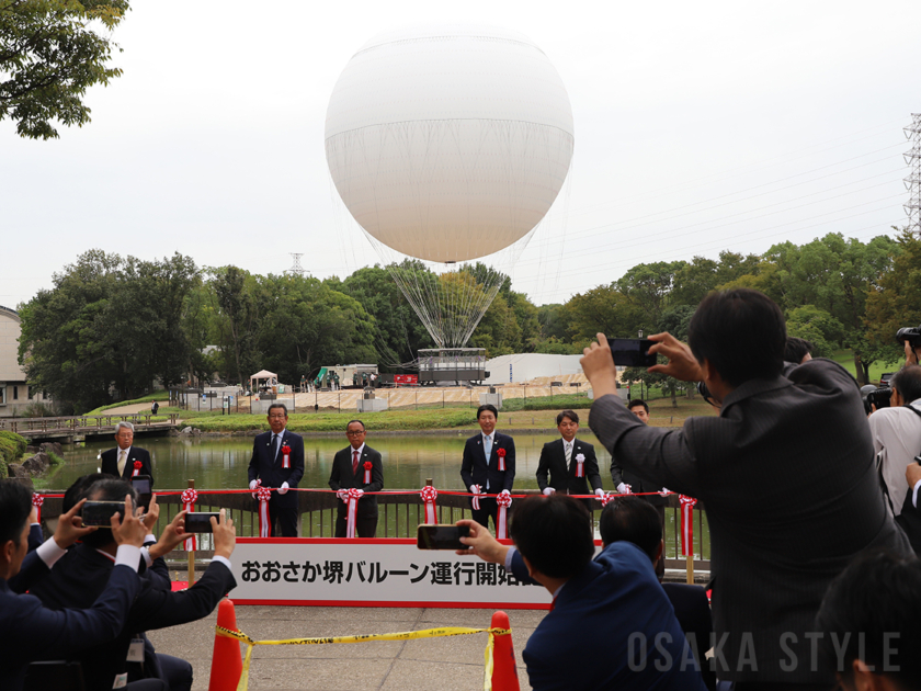 大仙公園(大阪府堺市)で10月3日、観光気球「おおさか堺バルーン」の運行開始を記念する式典が開かれ、吉村洋文大阪府知事と永藤英機堺市長が登壇した。