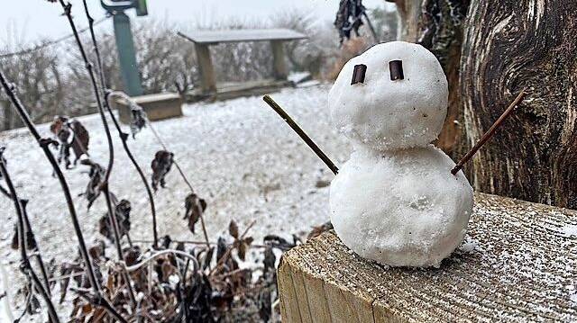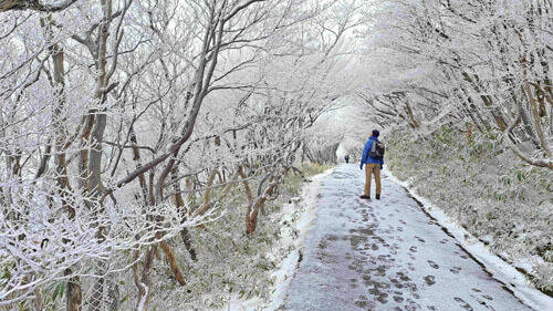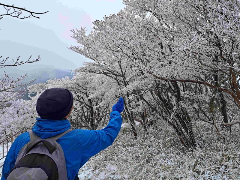 19日の朝7時ごろの気温はマイナス1度で、標高1000メートル付近(白鉄塔付近)から積雪となり、山上公園では2~3センチ積もったという。山上の木々の枝も白い氷の花に覆われた。