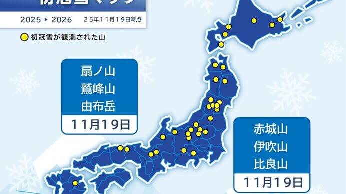 三重県菰野町の御在所岳で初冠雪と初樹氷を観測したと、11月19日、御在所ロープウエイから連絡があった。前日の18日には山頂付近で初雪が降ったといい、全国的な冷え込みの中、一気に季節が進んだ印象だ。初雪の観測は昨年より4日早いという。