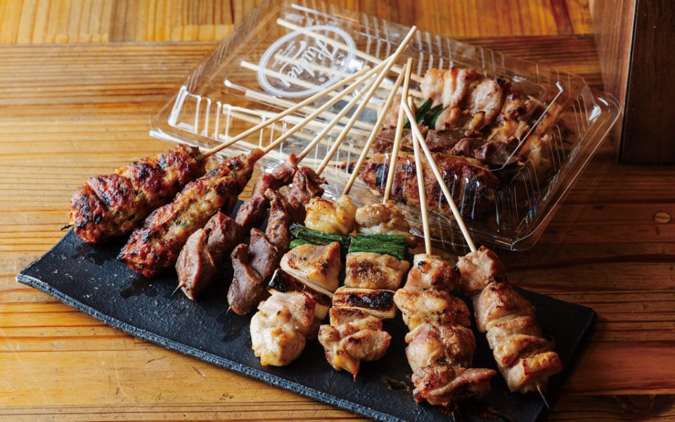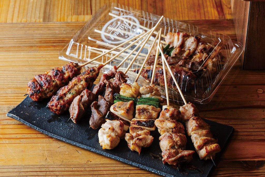 大鳥鶏肉店の焼き鳥(8本)1,500円。丸鶏の状態から店主が朝引きしているので、空気に触れる時間が短く鮮度がよく、身がしっとりやわらか。モモ、ネギマ、つくね、ずり、キモなどの8本セット。バラ売りなし。