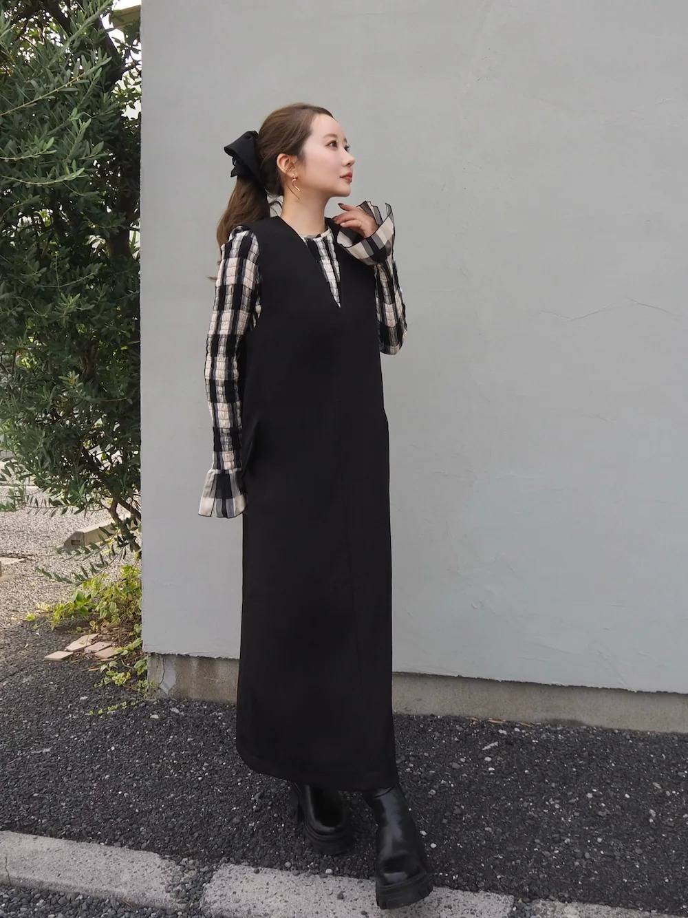 【初秋編】センスいい黒ワンピースコーデ②チェック柄のインナーをアクセントに♪