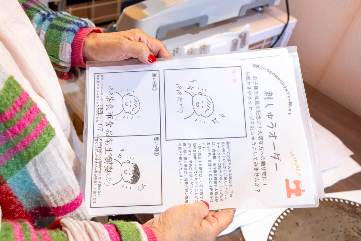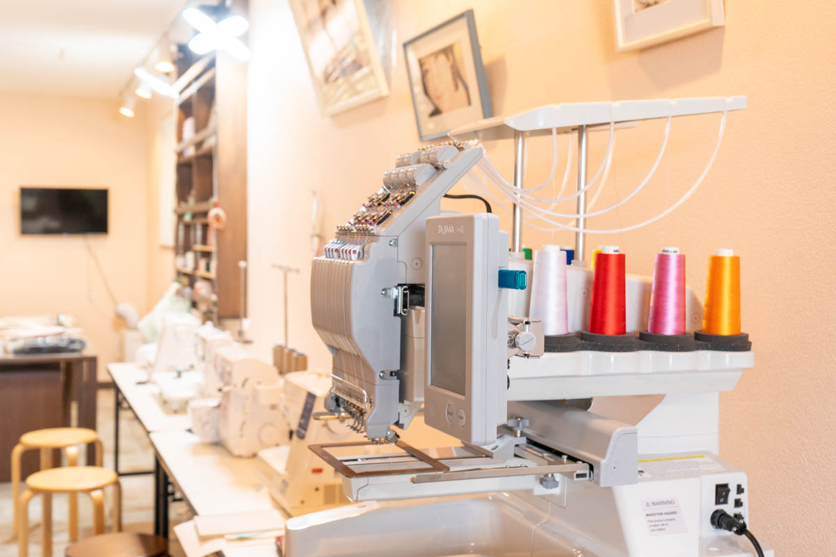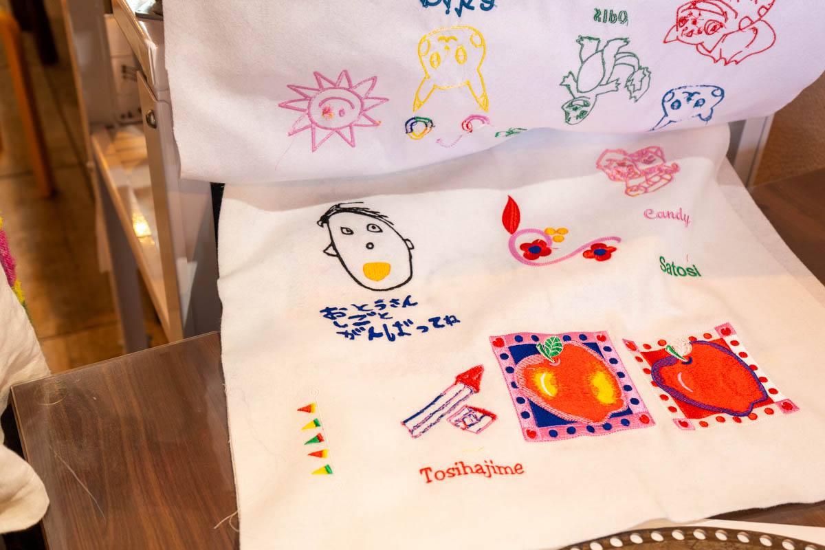 いろんなミシンがずらり。自分で書いたイラストを800円〜刺繍できるサービスなども行っているとのこと。父の日とかのプレゼントにめっちゃいいなと思いました!