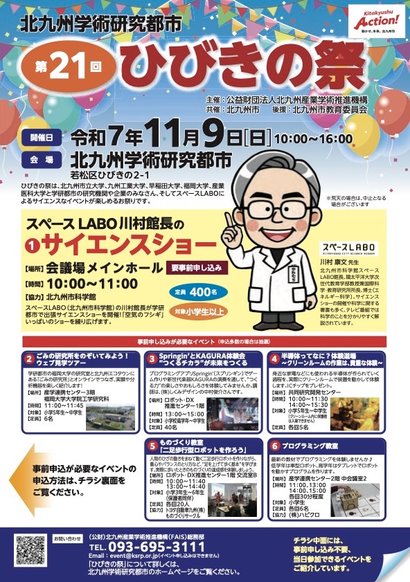 そのほか「クルマの未来館ひびきの」一般公開やシャボン玉スーパーチャレンジ、図書室での推理ゲームや図書・雑誌リサイクルフェアなども実施予定です。