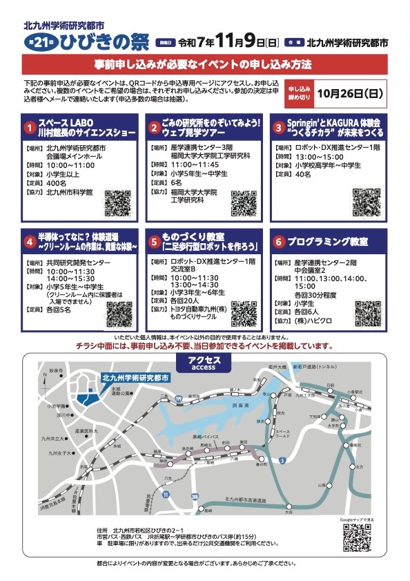 「第21回北九州学術研究都市ひびきの祭」が11月9日、北九州学術研究都市(北九州市若松区ひびきの2-1)で開催されます。