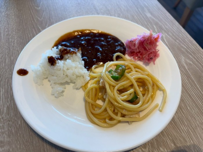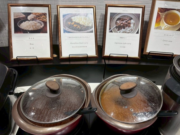 カレーも2種類あって、「二段仕込みのむさしのブラックカレー」と「和風カレー」を食べ比べ。