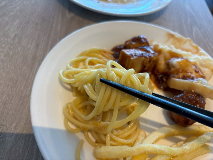 サラダでベースを整えつつ、2皿目は炭水化物に手を伸ばす。