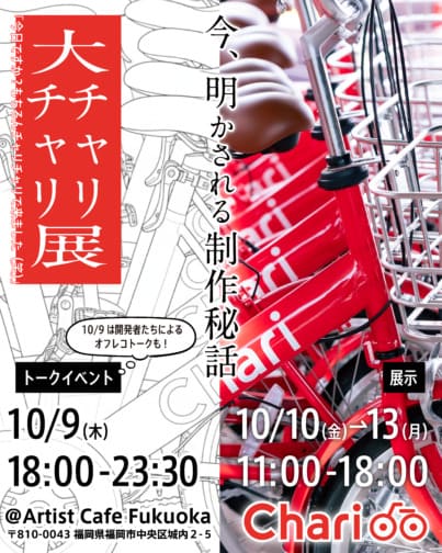 そんなチャリチャリは、2025年10月9日(木)〜10月13日(月・祝)の5日間、Artist Cafe Fukuoka グランドスタジオ(福岡県福岡市中央区城内2-5)にて「大チャリチャリ展」 を初開催!