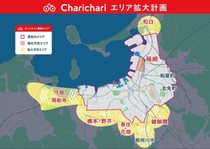 チャリチャリは、福岡エリアの事業計画を公表しており、今後、毎年1エリアずつ拡大していく見込みとなっています。