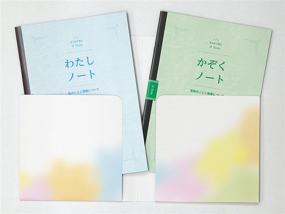 和歌山県がオリジナルで作成した「もしもノート」は、「わたしノート」と「かぞくノート」の2冊がセットになっています。開くと中に2冊収まるようになっています。