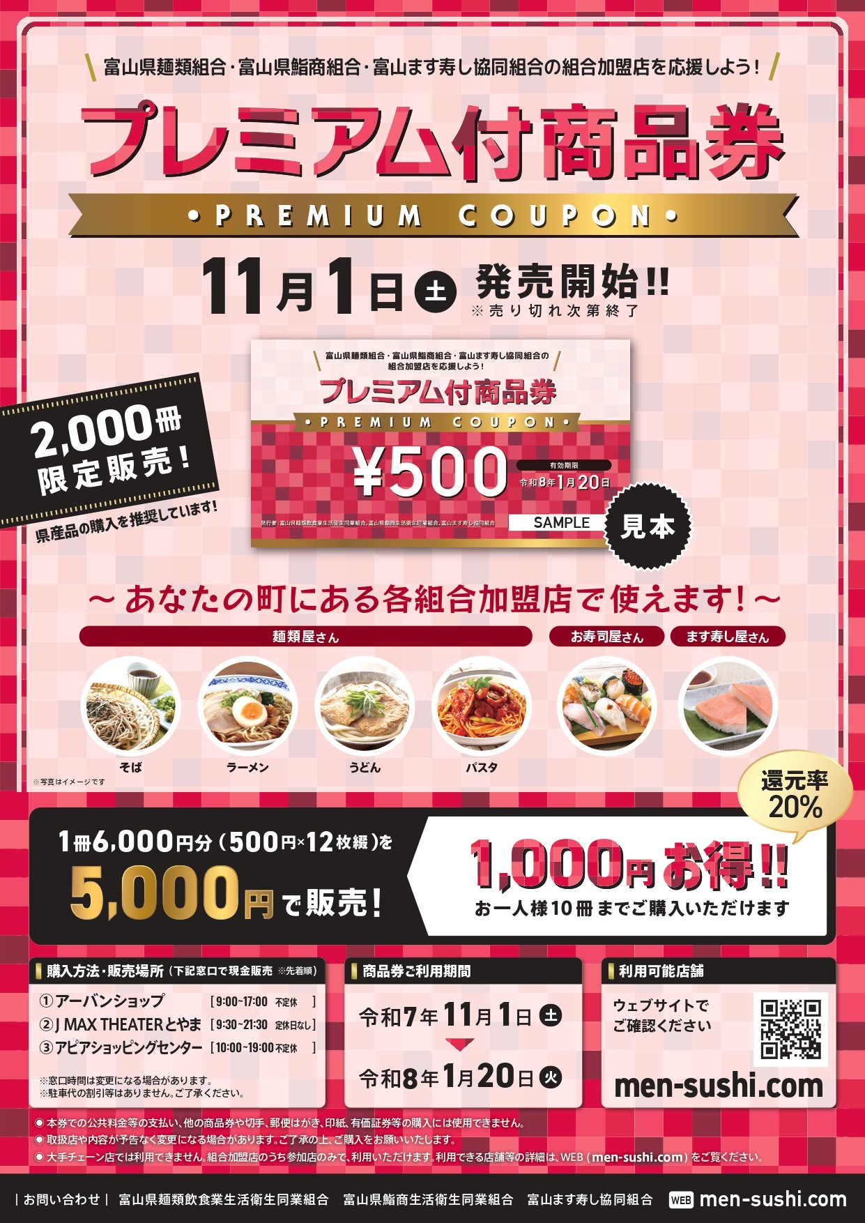 「おいしいものをたくさんの人に届けたい! 地域を盛り上げたい!」と、富山県麺類組合と富山県鮨商組合、富山ます寿し協同組合がタッグを組んで販売しているもので、麺料理店だけでなく、寿司店でも使えます。