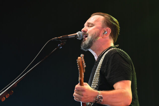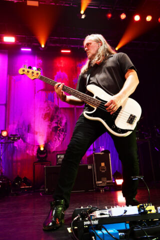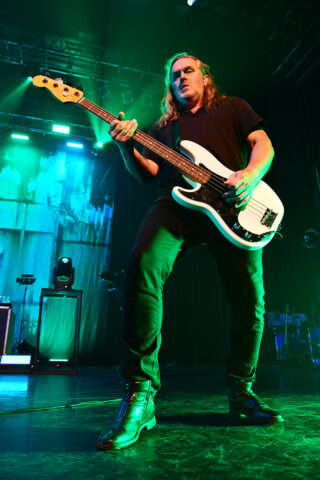 そんな、前置きと言うにはぜいたくな序盤戦が過ぎると、今回のライヴの本題。止まない拍手と歓声の中、1stアルバムの最後に収められていた怪しいSE(Gammel Intro)がじわりと流れ出す。先陣を切ったのはヘヴィなリフと透明感あるポップな歌メロ対比が面白い「Mother Nature’s Recipe」で、待ちに待った瞬間に対して観客たちから上がったリアクションは実に大きい。後半の展開部ではヘヴィなリフを引き伸ばすちょっとしたアレンジがあり、そのリズムに合わせてそこかしこで人々が飛び跳ねる場面も。続く「For God’s Sake」でもティムはブルージーなリフを自由に崩しながら弾き、適度なフックを曲に加える。ここまでで既に分かったのは、1stアルバムの30周年を祝うことを主題としながら、彼らが“完全再現”を全く念頭に置いていないこと。あくまでもショウとしての楽しさを最優先に曲を並べ、バンドの成熟とともに変わった曲の姿を見せる。アニヴァーサリー・ライヴとして実に正しい姿勢だ。「これが30周年記念ショウの始まりだ、足を運んでくれてありがとう。そして30年間も僕らの音楽を愛し、サポートしてくれて本当に感謝しているよ」…そんなティムの言葉に続くのは「Barbedwired Baby’s Dream」で、定番曲であるだけにアレンジも頻繁に変わる。今回はギター・ソロの後に不思議な浮遊感あるセクションを追加して披露され、最新の形を観客は思い思いに楽しんでいた。