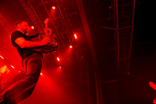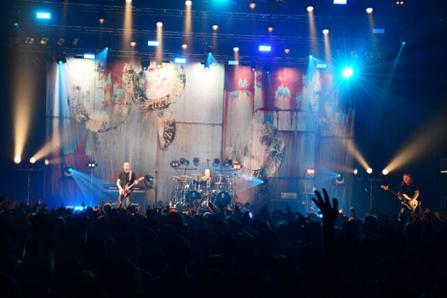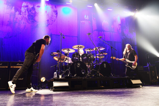 1stアルバムのジャケを廃墟の壁に写したようなバックドロップを背に、「The Ricochet」のSEが流れる中、メンバー3人が順に登場すると大きな歓声が上がる。前回公演時は『ALTER ECHO』(2023年)の世界観を再現するためサポートのキーボーディストを含んでいたが、今回は従来の彼ららしいトリオ編成だ。ティム・クリステンセン(g, vo)の黒いストラトから飛び出すムーディなギター・リフに導かれ、マーティン・ニールセン(b)とソレン・フリス(dr)の重厚なリズムが入ると、ヘヴィに始まったのはその最新作からの「In The Blood」。31年前の彼らとは全く異なるドゥームな曲調だが、そんな音楽性の振れ幅ぐらい問題なく受け入れるファン…というのが、ブランクはあれど歴史あるバンドならではだ。