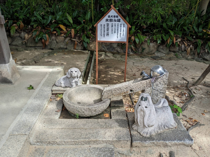 そのまま、まっすぐ進むと、願いを込めて石と拝殿を100回往復すると願いが叶うと言われている「百度石」や、犬の水飲み場が。自然豊かな境内を、ワンちゃんと一緒に散策するのもよさそうですね。