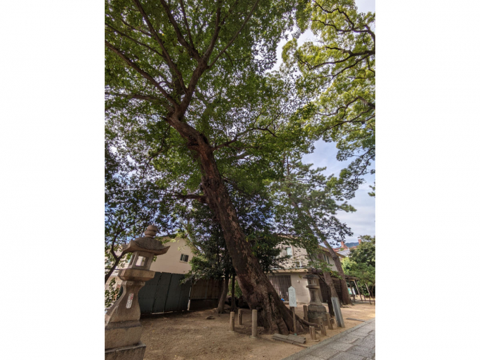 鳥居をくぐって境内に入ると、大きな椋(むく)の木がお出迎え。実は、この椋の大木は樹齢370年と神戸で一番長生きしている木で、神戸市の天然記念物にも指定されています。