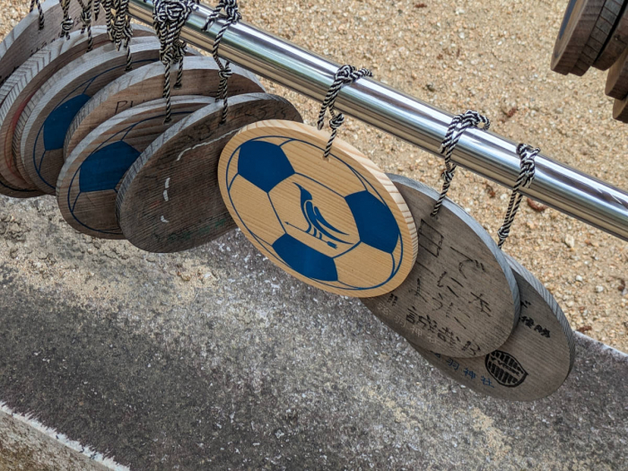 サッカーボールを模した絵馬には、プレー技術の向上や勝利を祈願するものに加えて、プロ選手の活躍を祈願するメッセージがしたためられていました。
