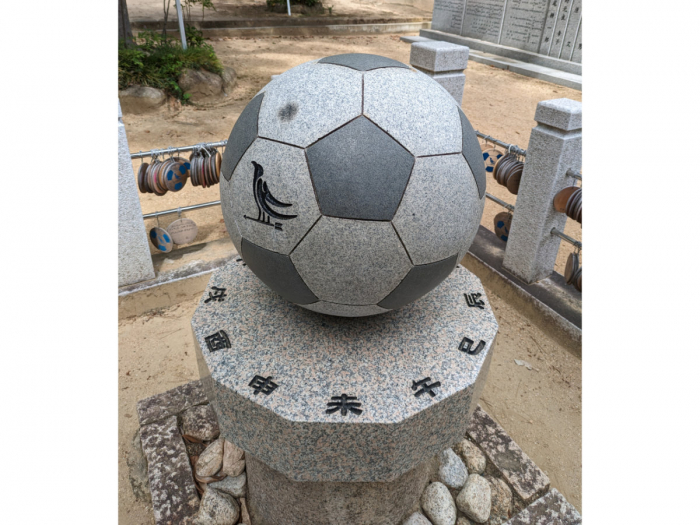 本堂横に設置された、八咫烏の描かれた「御影石のサッカーボール」は、本神社のシンボル的な存在です。