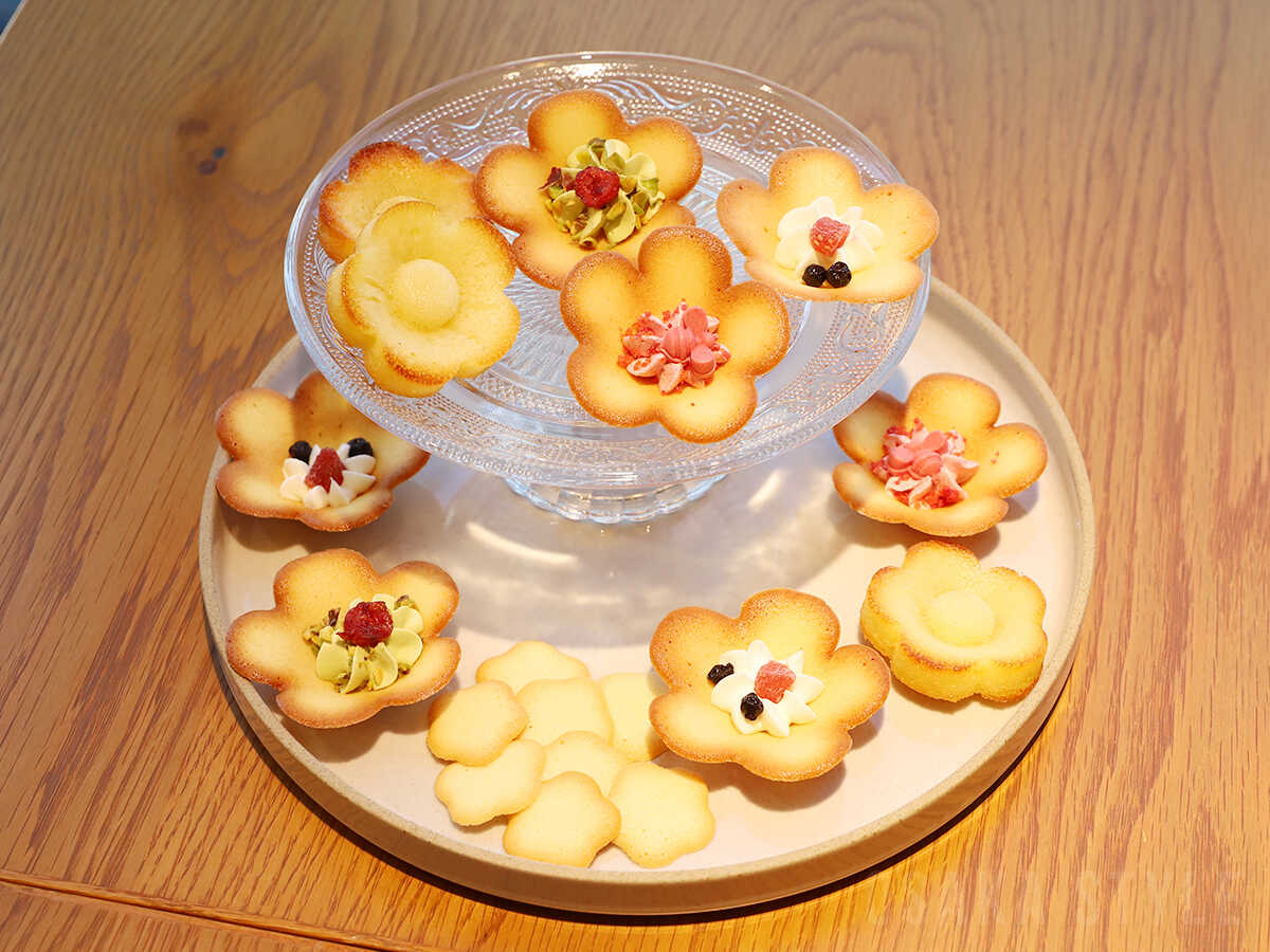 「花ラングガーデン」では、「花ラング オリジナル」(4個入=778円、8個入=1,556円、16個入=3,111円)をはじめ、限定フレーバーの「花ラング ピスタチオ」(4個入=908円、8個入=1,815円)、「花ラング ベリー」(4個入=908円、8個入=1,815円)、さらに「花フィナンシェ」(6個入=1,167円、10個入=1,944円)、「花クッキー缶」(1,944円)を販売する。