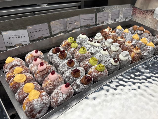 黒胡麻ブリオッシュ生地を使用した「黒胡麻生フレンチクルーラー」、マーブル模様のチョコレートで宇宙を表現した「スペイシーブルー」、みたらしベースをコーティングして炙りグレースをかけた京都ならではの「みたらし」など、遊び心あふれるドーナツが勢ぞろい。