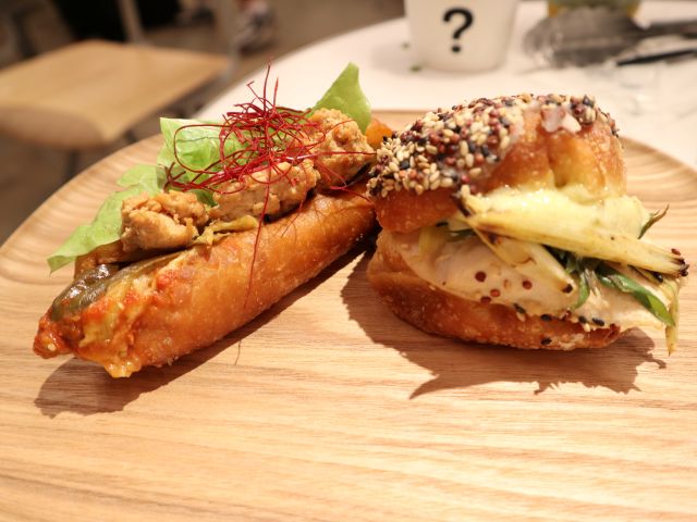 左から「鶏むね肉と九条ネギの柚子胡椒ゴマだれサンド」、「京茄子そぼろあん」各518円