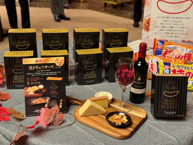 同じく10月1日(水)からは「タネビッツ」の「黒トリュフチーズ」もお目見え。柿の種にポルチーニ風味の薄衣をまとわせ、黒トリュフ塩とチーズパウダーを合わせた贅沢な仕上がりは、お酒のお供にもぴったり。夜のリラックスタイムがちょっと華やぐ一品です。
