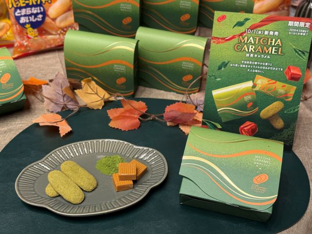 「ハッピーターンズ」からは、10月1日(水)より期間限定の「抹茶キャラメル」が登場。宇治抹茶の香りとコクのあるキャラメルが重なり合い、ほろ苦さの中にやさしい甘みが広がる大人の味わいです。