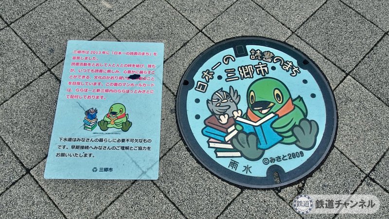 足下のマンホールの蓋「日本一の読書のまち 三郷市」です。横の説明に由れば「三郷市は2013年に「日本一の読書のまち」を宣言しました。読書活動をとおして人と人との絆を結び、誰もが、いつでも読書に親しみ、心豊かに暮らすことができる、文化のかおり高いまちを創ることを目指しています。」とあります。
