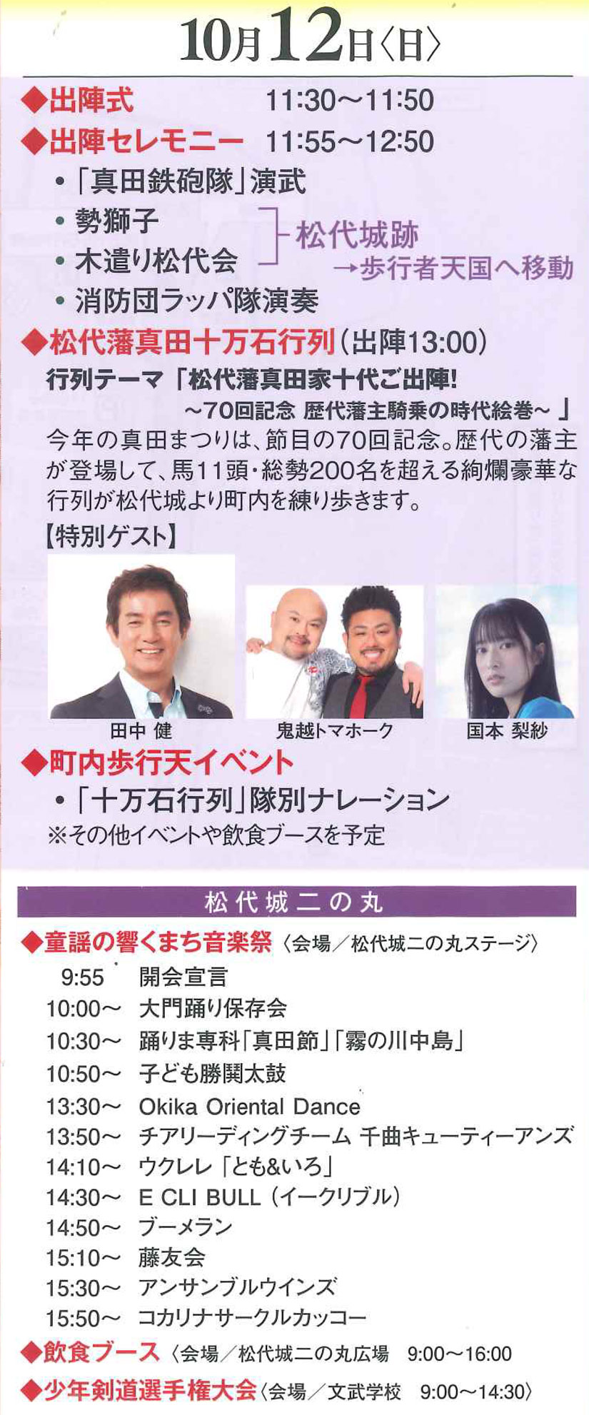 今年は70回目となる節目の年。今年の『松代藩真田十万石まつり』では、史上初となる「松代藩」の「真田家」十代が一堂に会し、馬11頭、総勢200名を超える市民が、甲冑や袴に身を包み大名に扮した行列が市街を練り歩きます。特別ゲストには、俳優の田中健さん、長野県出身の鬼越トマホーク、女優の国本梨沙さんが来場。その他にもステージ飲食ブースなどもあり、会場を盛り上げます。