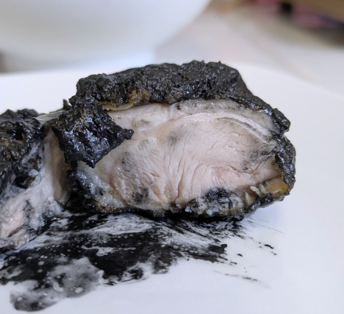 半割にすると鶏肉であることがわかってもらえるだろう。やはり竹炭パウダーを溶く水が多かったので、もう少し硬めにパウダーを溶くことをおすすめする。そうしないと、これのようにベッチャリ仕上がりになってしまうので。