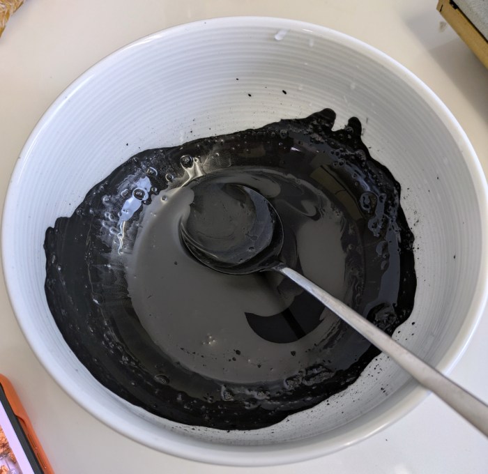 漬け込んでいる間に、竹炭パウダーを水で溶く。ダマにならないように水を少量ずつ加えながら混ぜるのだが、竹炭パウダーを使ったことがないので、加減がよくわからなかった。