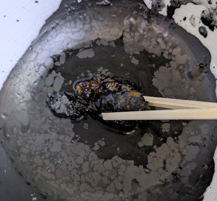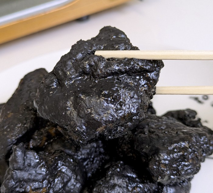ひとつ箸でつまみ上げてみると、漆黒ゆえに影との境目がわからずに、持ち上げていないように見える。まさしくブラックフライデーにふさわしい黒さよ……。