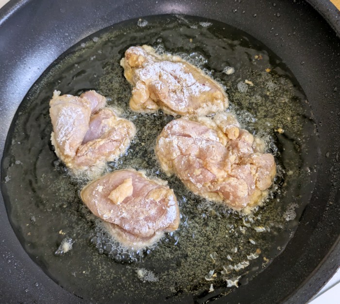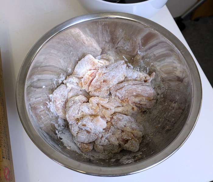 さて、ある程度漬け込んだので、ボウルで揚げ粉をまんべんなくまぶします。