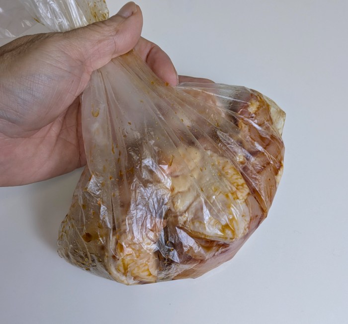 竹炭パウダーを使うことを除けば、一般的なから揚げの作り方と同じ。まずはひと口大の鶏肉に下味をつける。今回使用した日本食研の「から揚げ作り」には特製の醤油だれが付属していたので、こちらに漬け込みます。
