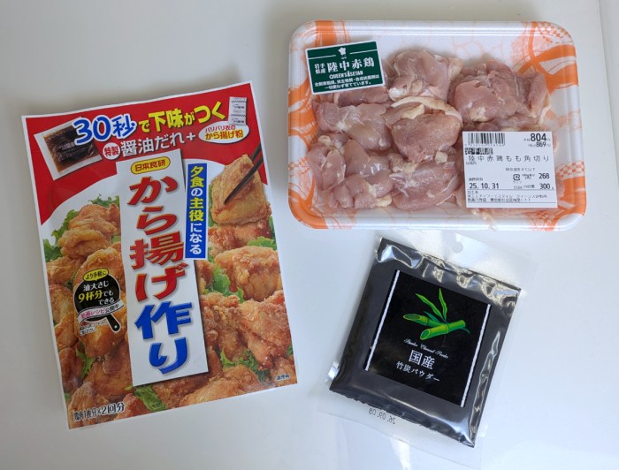用いる材料は鶏肉・から揚げ粉、それに竹炭パウダーだ。