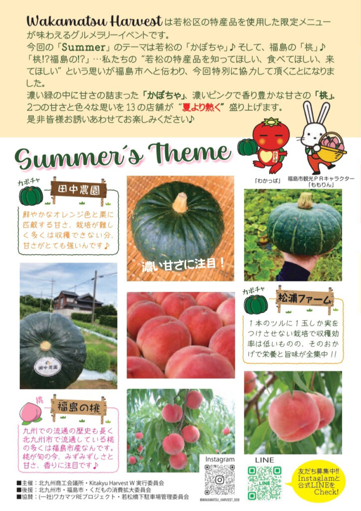 イベント名:Wakamatsu Harvest Summer 開催期間:2025年8月22日(金)〜8月31日(日) 内容:かぼちゃ・桃をテーマにしたオリジナル限定メニュー販売、スタンプラリー抽選会 参加店舗数:13店舗(若松区・八幡西区・水巻町)