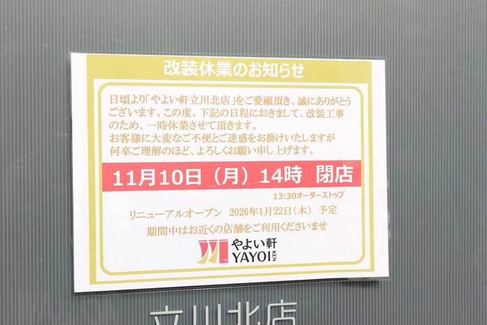 《休業》来年1月までのロング休業。立川駅北口の定食屋『やよい軒 立川北店』が休業してる。2026年1月22日(木)リニューアルオープン予定