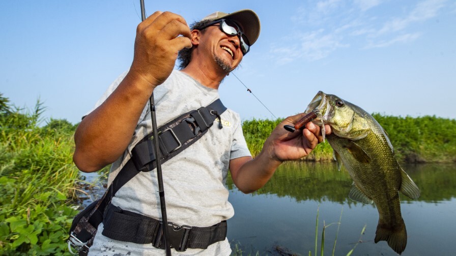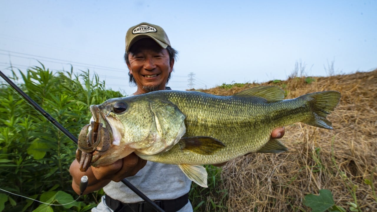 1匹目は6時過ぎ。水路の角、最もカレントが当たるアシ際で食ってきた。しかしその後はショートバイトやフッキングミスに苦しむ。おそらく30度は優に超えている高水温でバスのバイトが弱くなり、3/4ozシンカーを背負ったリグをしっかり吸い込めないのだろう。カバー越しにアプローチするウエッピングの特性上、フッキングパワーが伝わりづらいこともミスにつながっただろうが、これはある程度はやむをえない。