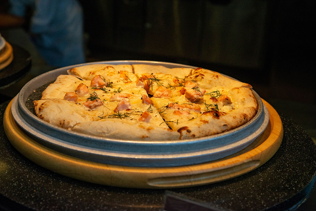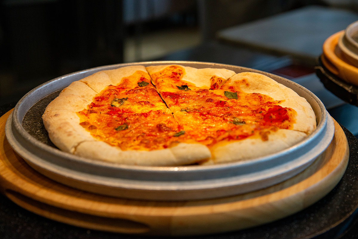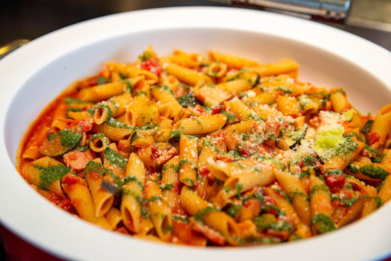 その他、ピザ窯で焼かれた出来立てのピザは「サーモンとハーブのタルトフランベ」、定番の「マルゲリータピザ」。ペンネは「トマトとバジルの菜園風」と、クリスマスらしいカラーで思わずよそってしまいました。
