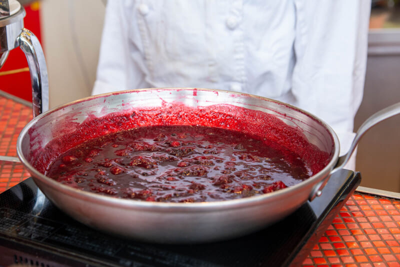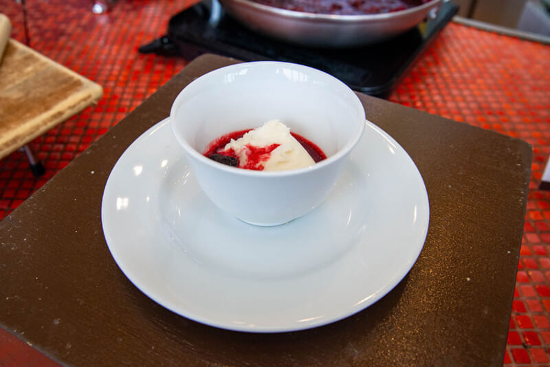 ライブキッチンでいただけるのは「フルーツフランベとアイスクリーム」。ほどよい酸味と甘さが絶妙なベリーのソースを冷た~いアイスクリームにたっぷりと…。温かさと冷たさが口の中で合わさり、なんとも言えない美味しさが口いっぱいに広がります。