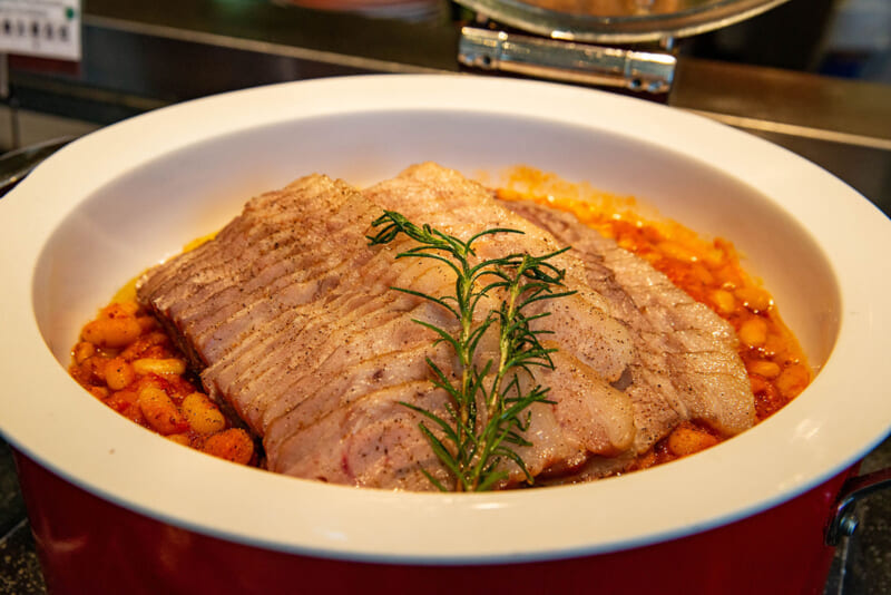 続いて「ローストポークのカスレ仕立て」。しっとりと焼き上げられたローストポークは、ナイフがすっと入る柔らかさで、とにかくジューシー。一緒に煮込まれた白いんげん豆はほっくり温かく、噛むたびにやさしい甘みが広がります。思わず“冬だなぁ”と感じてしまう、心温まる味わいです。