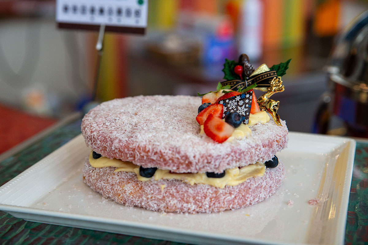 他にも冬らしく、クリスマスらしいスイーツが勢ぞろい!リンゴのコンポートがゴロゴロっと入った「アップルパイ」に、カスタードクリームがたっぷりの「苺のレミントン」。