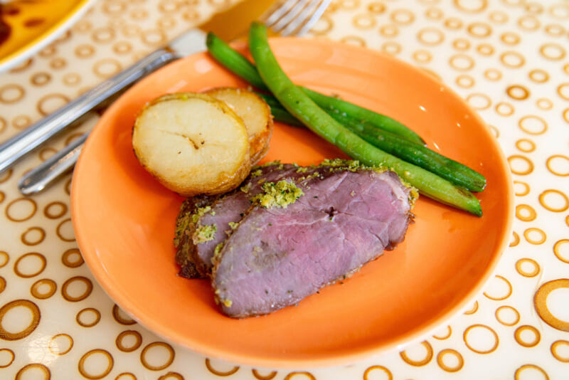 そして今回のメインの中でも、特別感がひときわ光っていたのが「ジゴダニョーのペルシャード」。仔羊肉に香草パン粉をまとわせ、じっくりローストした、クリスマスのご馳走そのものの一品です。しっとりとみずみずしく、クセが控えめで食べやすい仕上がり。香草のほのかな塩味が仔羊の旨みをふわっと引き立てていて…思わず「美味しい!」と笑顔になってしまいました。