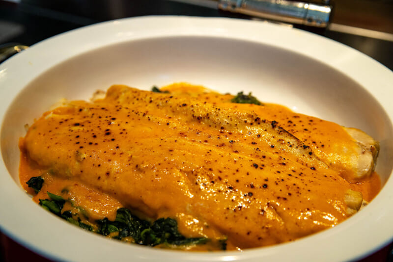 「白身魚のカルディナール」も忘れられない一皿。柔らかく甘みのある白身魚に、濃厚なソースを贅沢にかけていただきます。ふっくらと蒸し上げられた身はしっとりとしていて、口の中でほどけるような優しい食感。ほっと温まる冬の味わいがじんわり広がります。