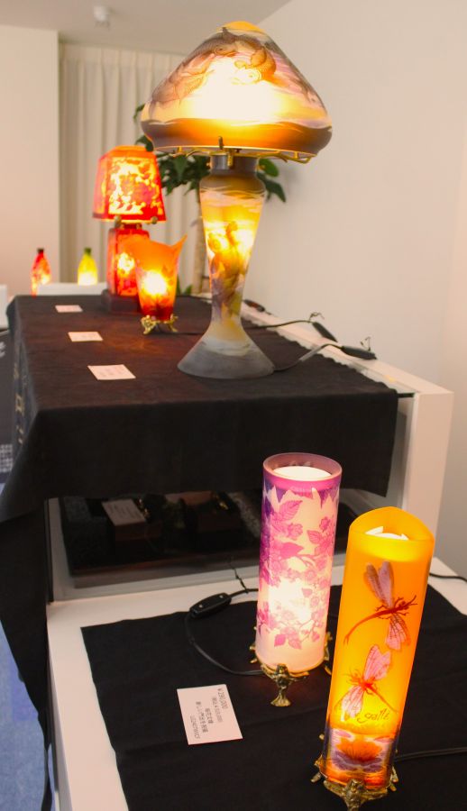 ガレは昆虫や植物を描く自然主義的な作風と、日本文化へのあこがれを感じさせるジャポニズムに影響された作風が混在するとされ、展示された現代の作品にもトンボが飛ぶ様子や日本画的な絵柄が多く見てとれるという。