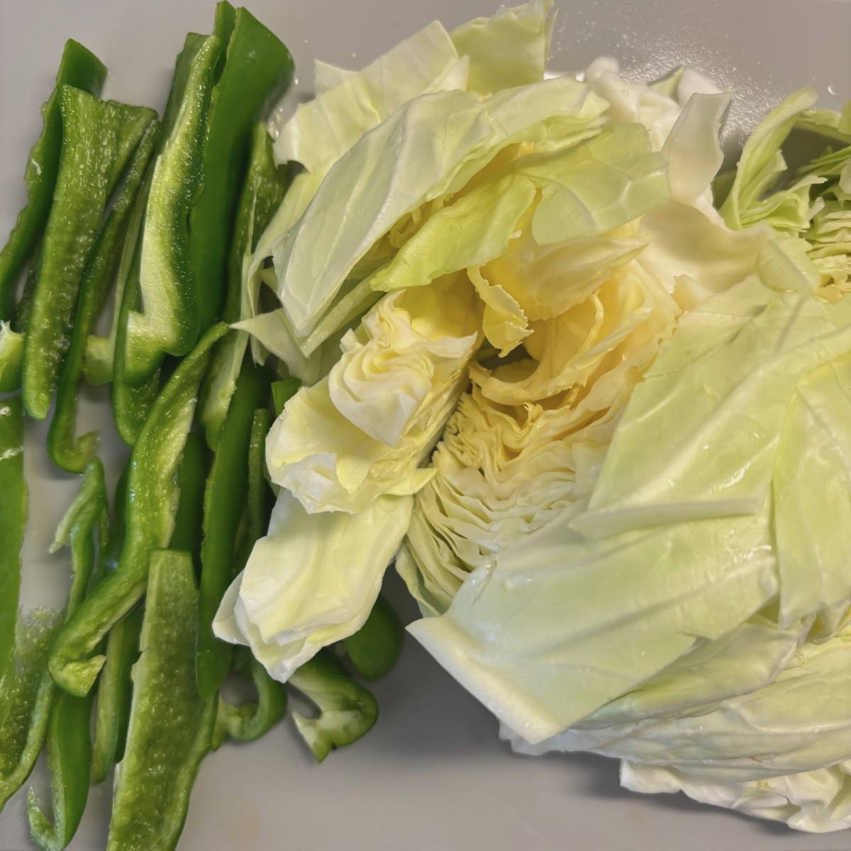 キャベツ・ピーマン・豚肉を食べやすい大きさに切りましょう。
