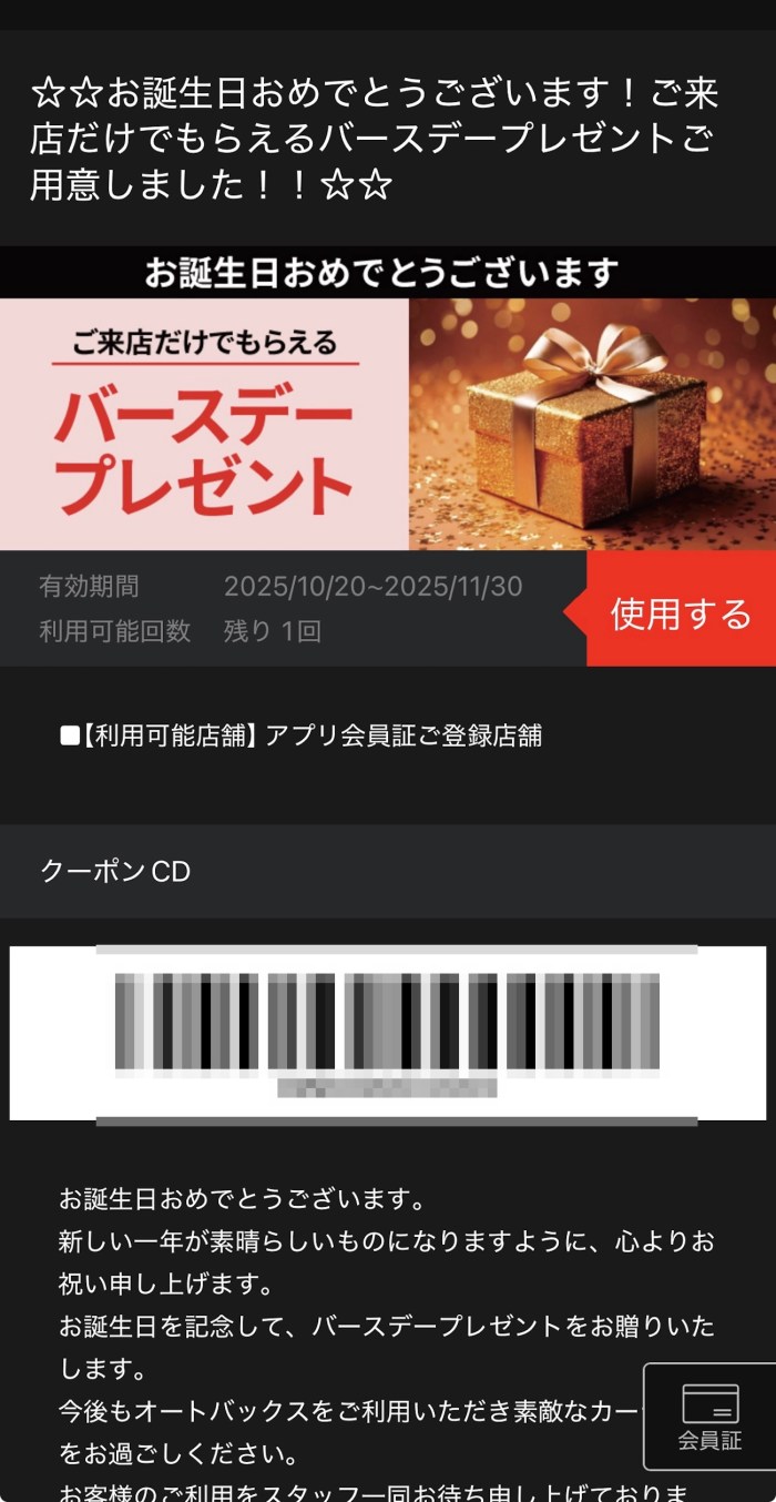 誕生日は約1カ月先なのだが、スマホアプリのクーポン画面を確認すると、たしかに「バースデープレゼント」の文字が表示されている。どうやら誕生日の1カ月前から使えるようになっているらしい。そういえば昨年ももらったような……