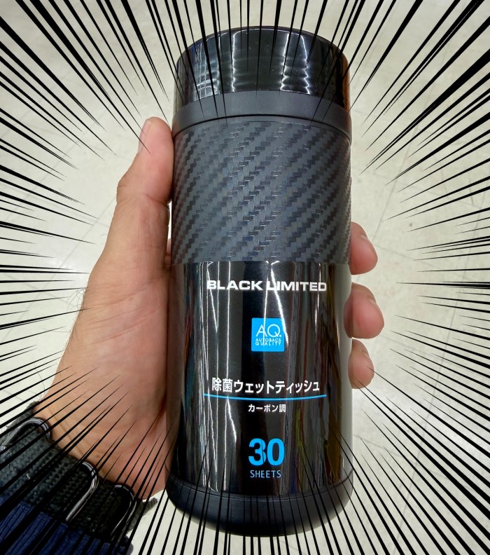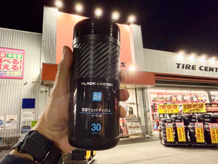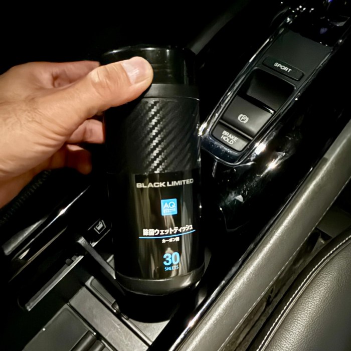 今年のバージョンは「BLACK LIMITED」と書かれたカーボン調のボトルで、見た目もパワーアップ。カーボン柄は高級感があるし、30枚入りで車内に置いておくのにちょうど良いサイズ感。ドリンクホルダーにピッタリ収まるのがポイントだ。