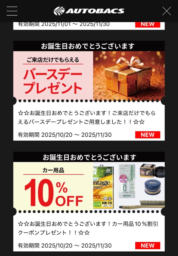 またオートバックスのスマホアプリで会員登録(無料)をしておけば、誕生日に限らずお得なクーポンや会員限定のキャンペーン等も行われるので興味があればチェックしておこう。