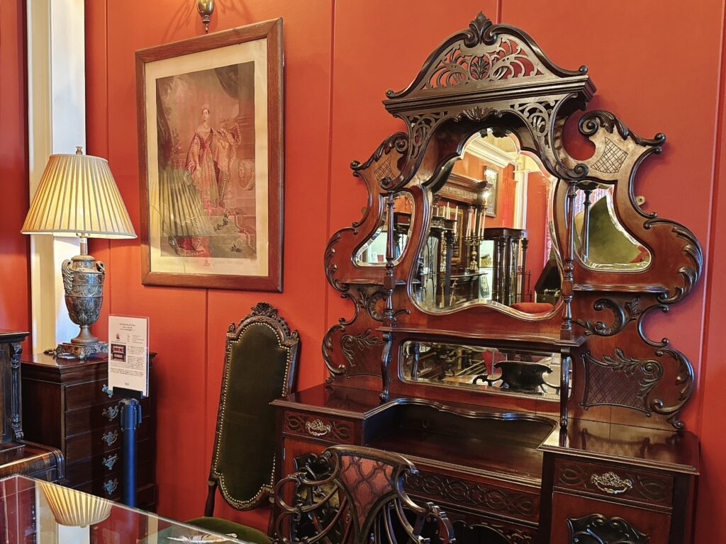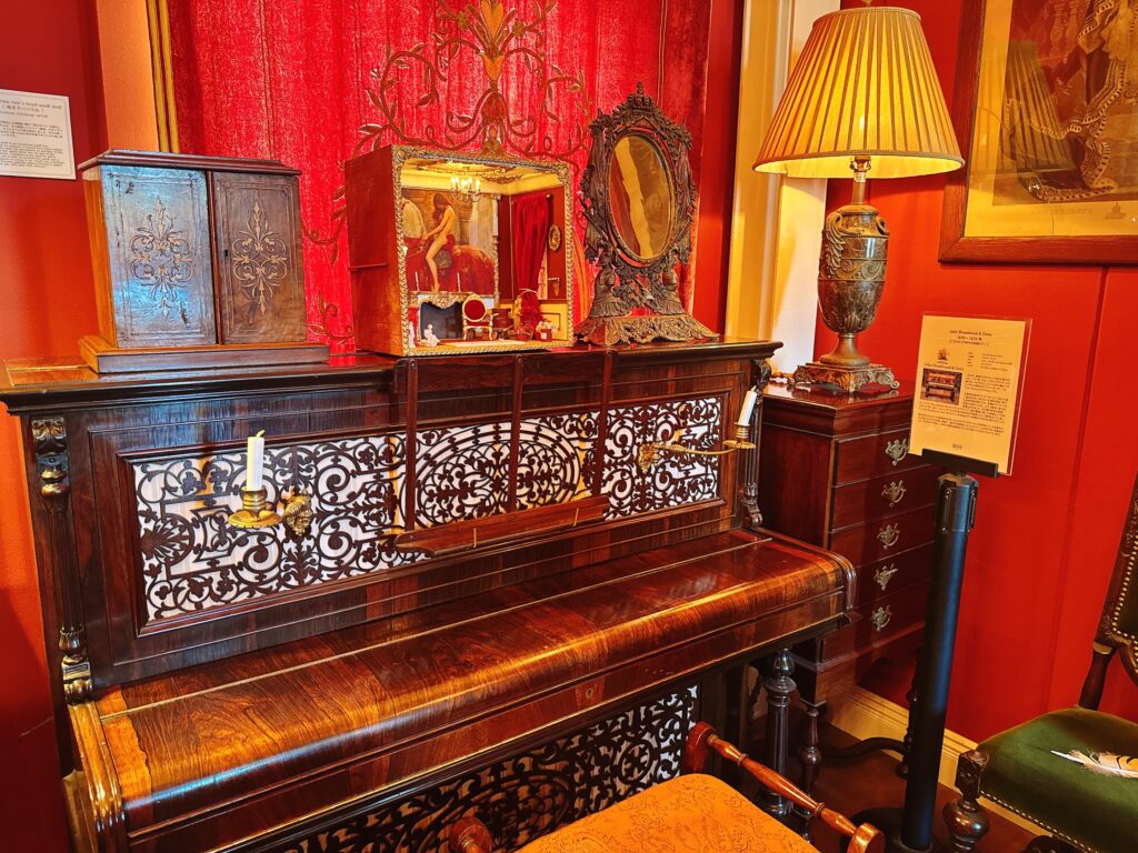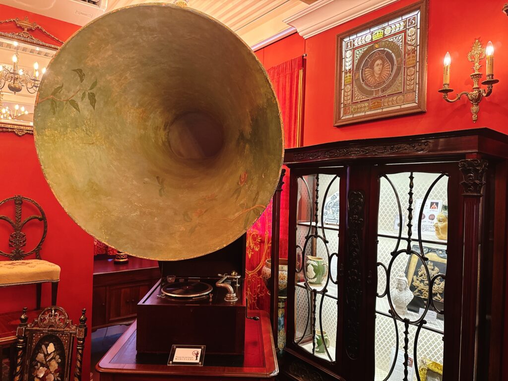 曲線的なキドニーデスクやパーラーキャビネット、英国王室御用達のジョン・ブロードウッド・アンド・サンズのピアノ、英国最高峰の巨大蓄音機など装飾美を感じる品々が並びます。