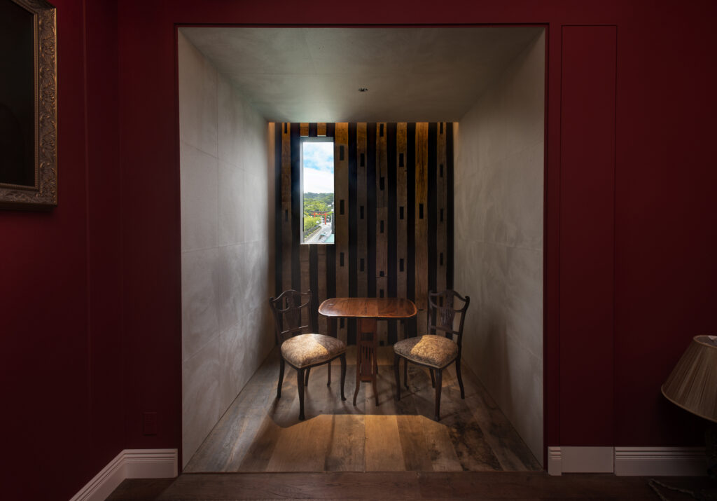 茶室の壁の模様にも800年前の木が使われており、「自然の大切さやアンティークの技術、文化を次世代に伝えていきたい」という土橋さんの想いが込められた場所です。