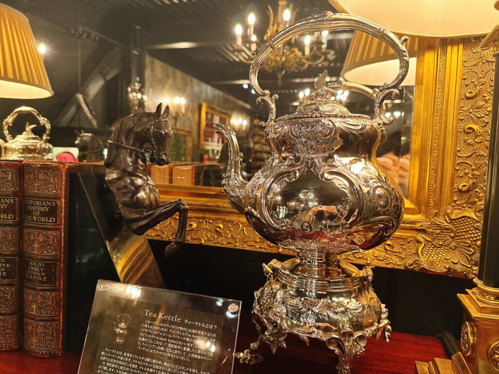 また、焼き菓子を保温する時に使うビスケットウォーマーや、イギリスの伝統的なアフタヌーンティースタイルであるスリーティアーズ(3段スタンド)など、ケトルとともにティータイムを彩った銀食器たちが輝く光景は圧巻!